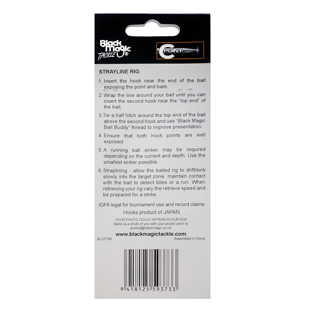 Featuring high penetration Black Magic C POINT hooks, each Black Magic C Point Hook Strayline Rig consists of 2 hooks and a lumo bead tied on 60lb Tough Trace. Pre-tied and ready to fish straight from the pack.