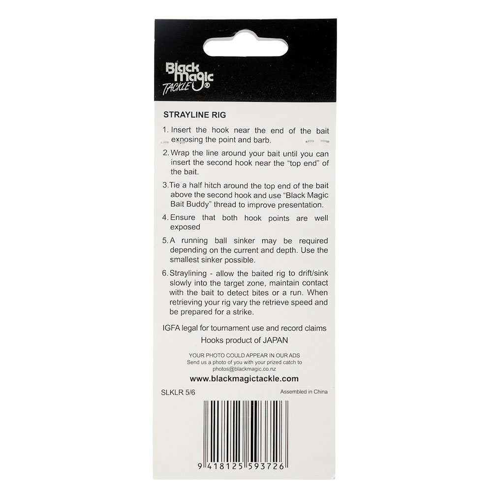 Featuring high penetration Black Magic recurve style KL red hooks, each Black Magic KL Red Hook Strayline Rig consists of 2 hooks and a lumo bead tied on 60lb Tough Trace. Pre-tied and ready to fish straight from the pack.