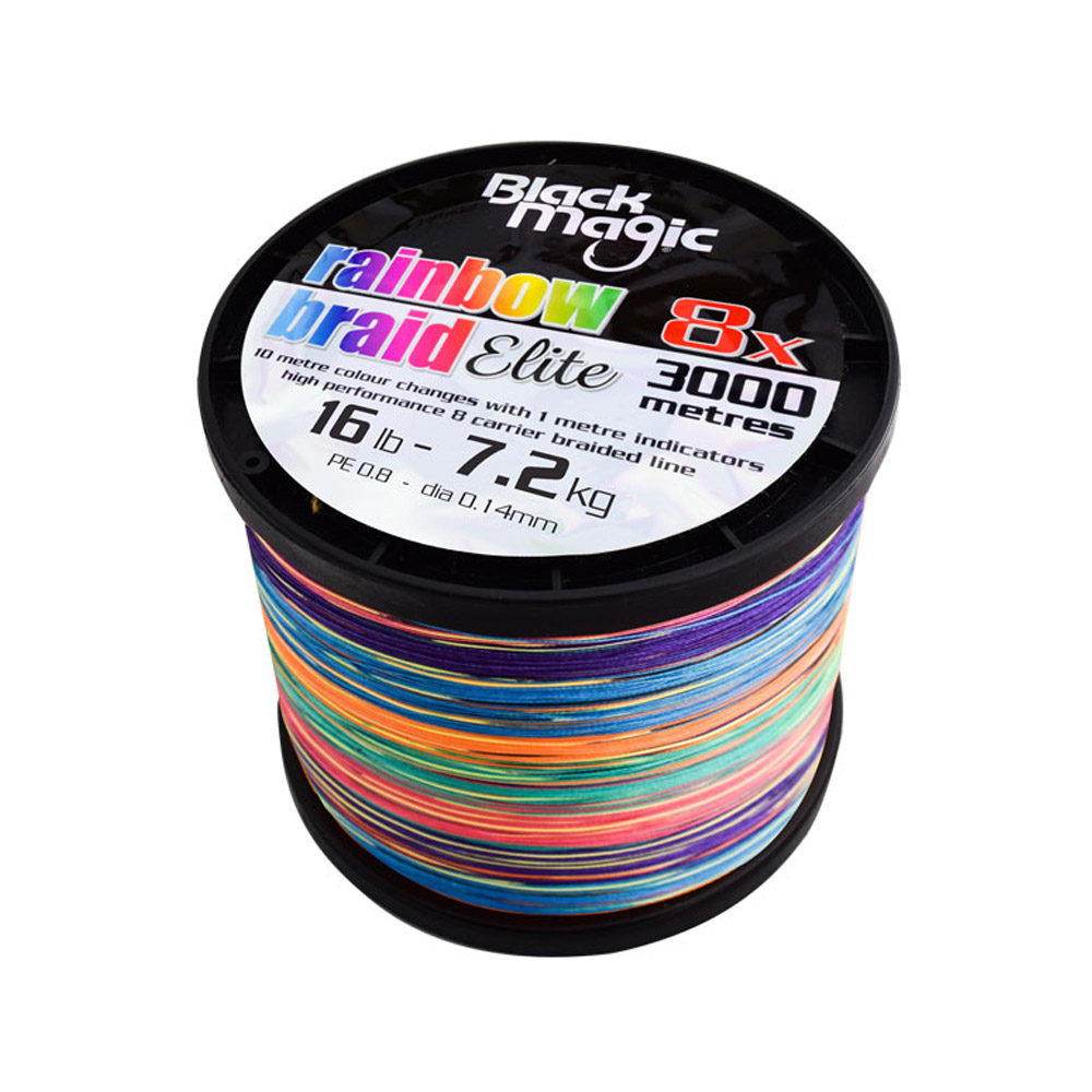 The Black Magic Rainbow Braid Elite is still braided from 100% Japanese PE fibre, but unlike many other alternatives on the market, it is an 8 carrier braid (8 braided strands). This provides greater strength from a finer diameter and its smooth, round shape allows for long accurate casts.
