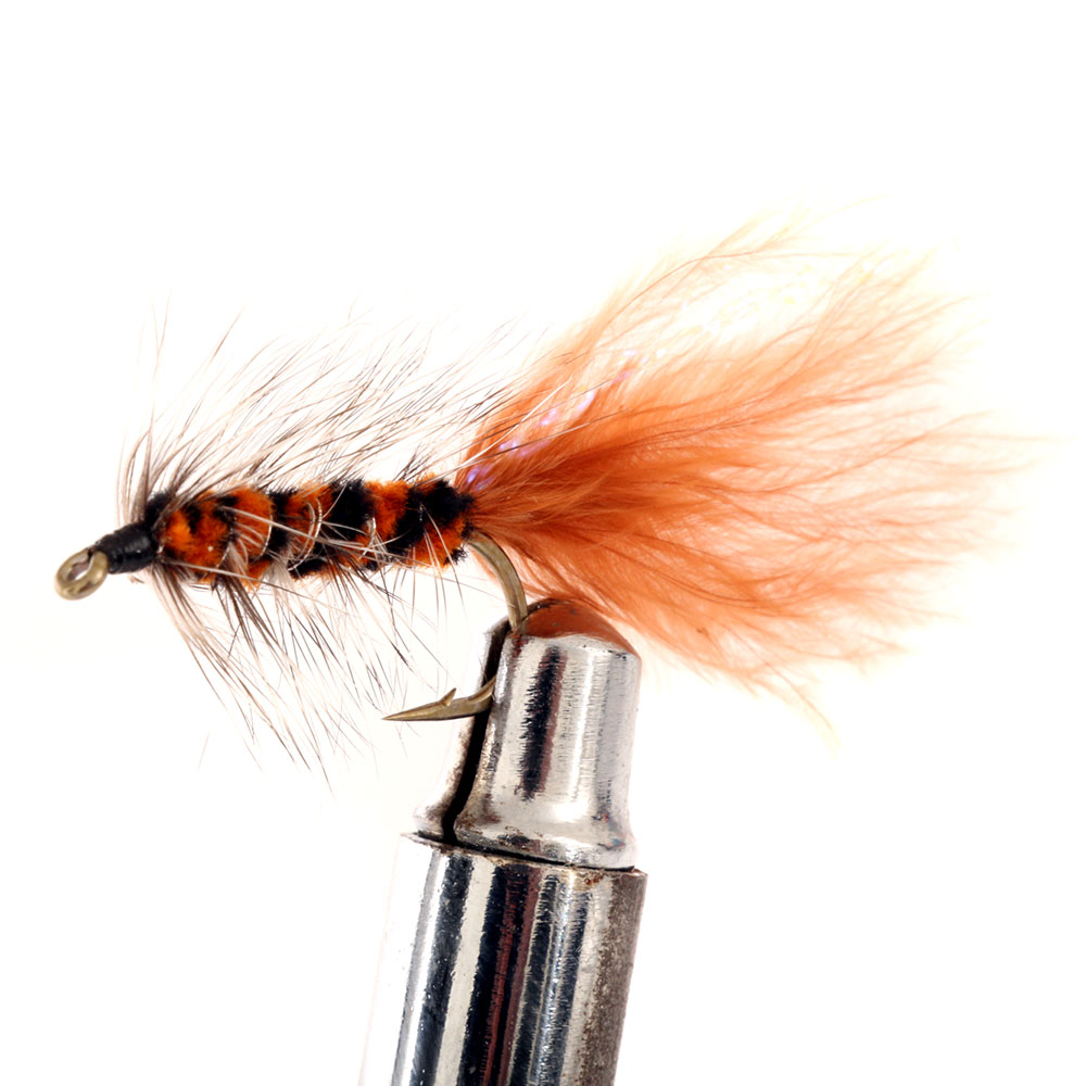 fly box. Each top fish-catching fly features a variegated chenille